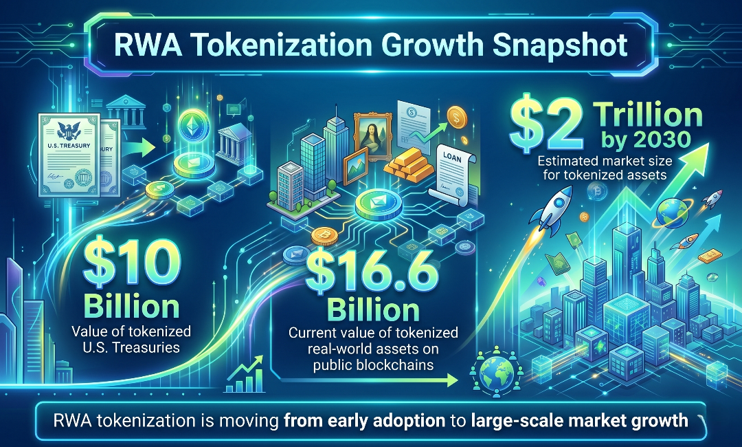 If you follow finance or crypto, you have likely seen the term RWA tokenization more often in recent years. That interest is backed by real numbers. Public blockchain data shows about $16.6 billion in tokenized real-world assets, and tokenized U.S. Treasuries alone account for nearly $10 billion. Market forecasts also point to rapid growth. Estimates suggest tokenized assets could reach around $2 trillion by 2030, excluding cryptocurrencies and stablecoins. These numbers show that RWA tokenization is not a passing trend. It reflects a shift in how people think about ownership and investing. For years, traditional finance relied on paperwork, middlemen, and limited access. Now, digital systems are opening access to a wider group of investors.